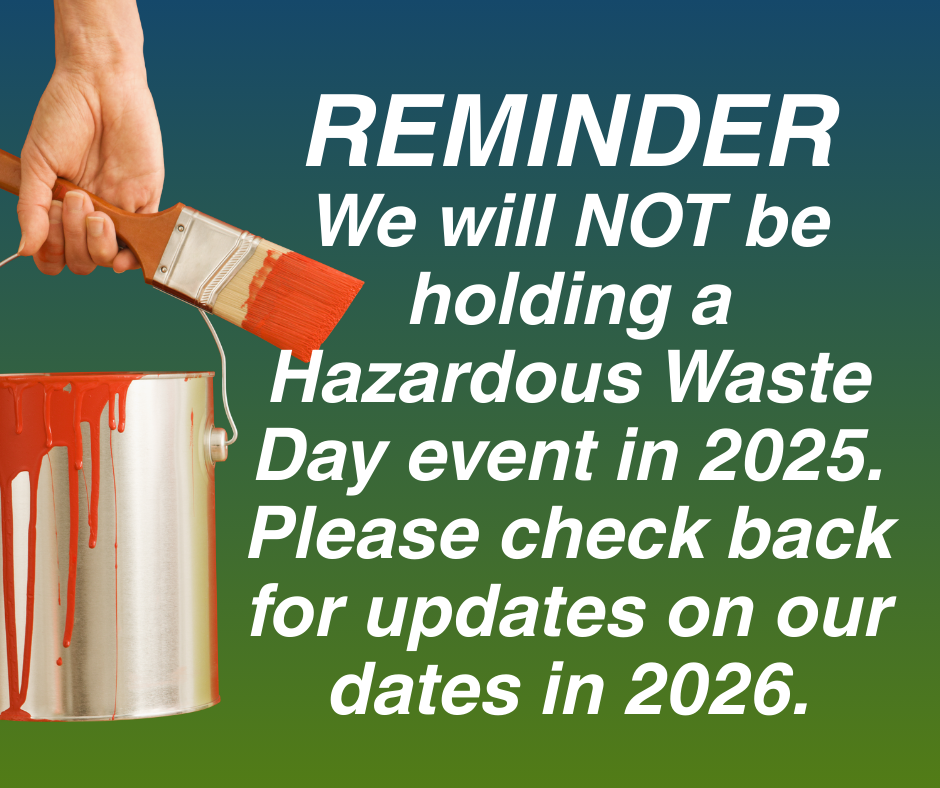 We will NOT be holding a Hazardous Waste Day event in 2025. Please check back for updates on our dates in 2026.