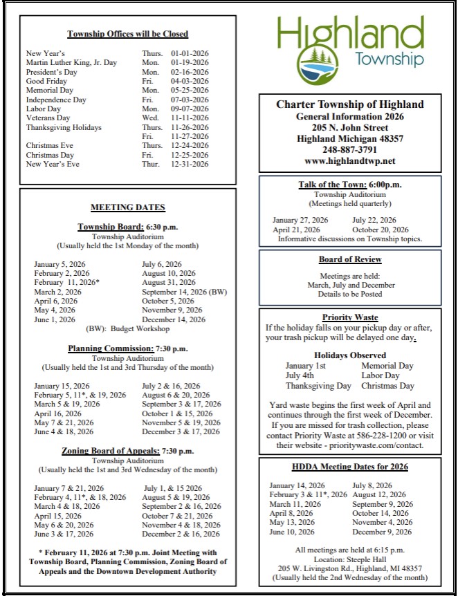 Highland Township Board of Trustees Meeting Monday December 8th, 2025 at 6:30 p.m. the Highland Township Auditorium 205 N. John Street, Highland, MI 48357