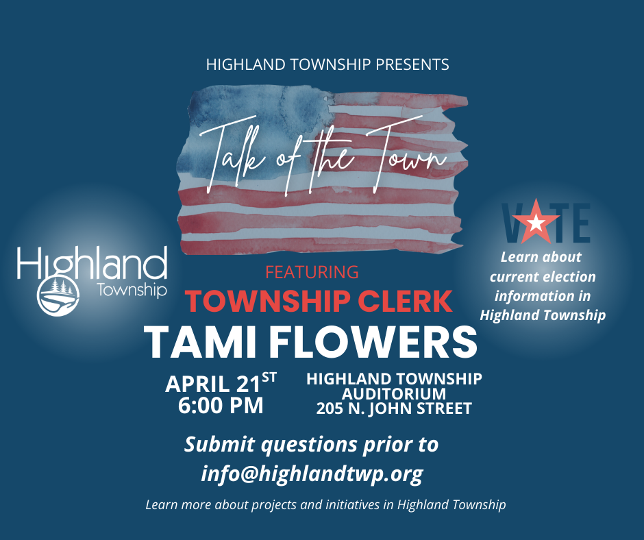 Join us for our Second Talk of the Town event on Tuesday, April 21st at 6:00 PM at the Highland Township Auditorium.Talk of the Town is a quarterly program...